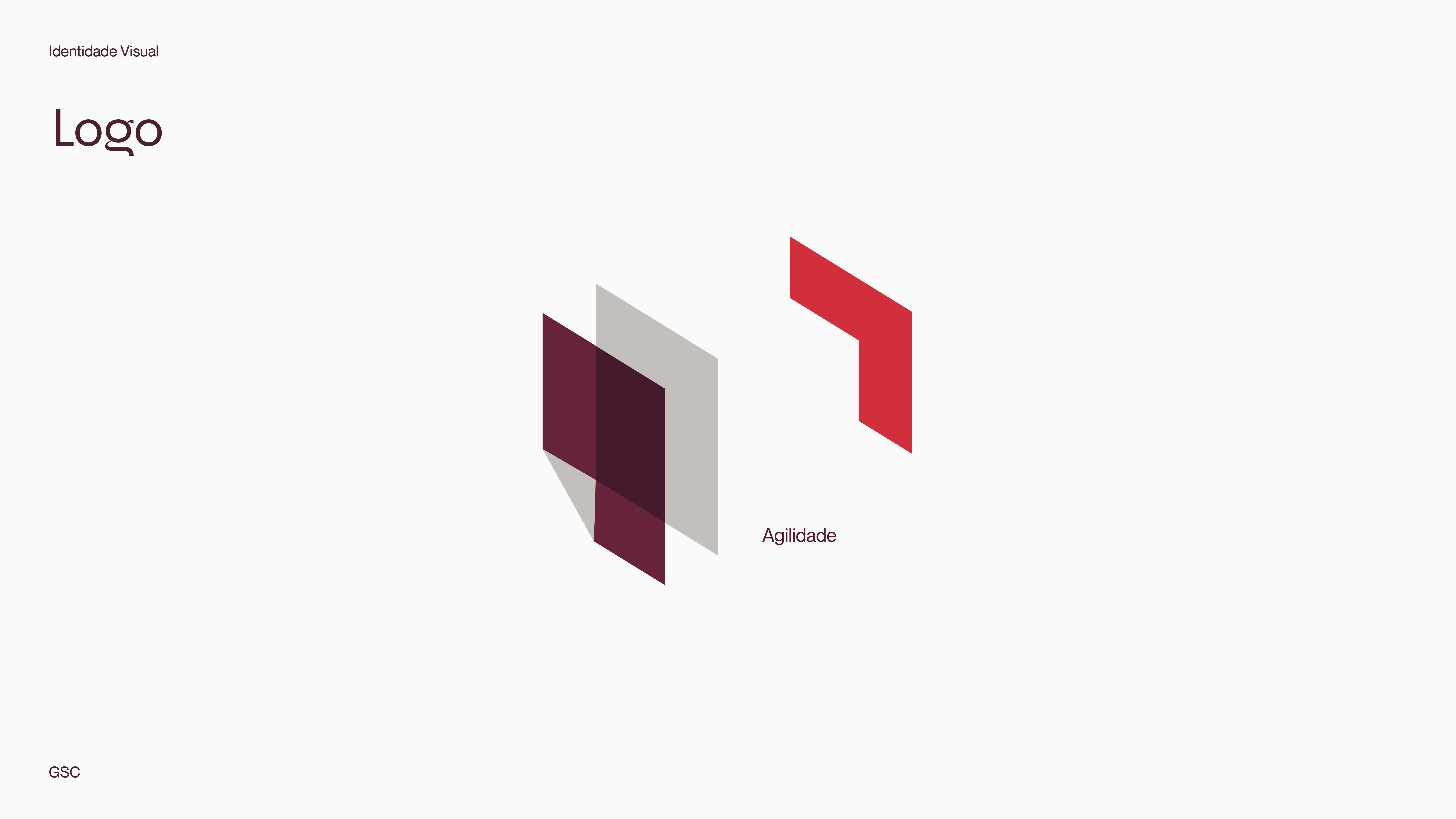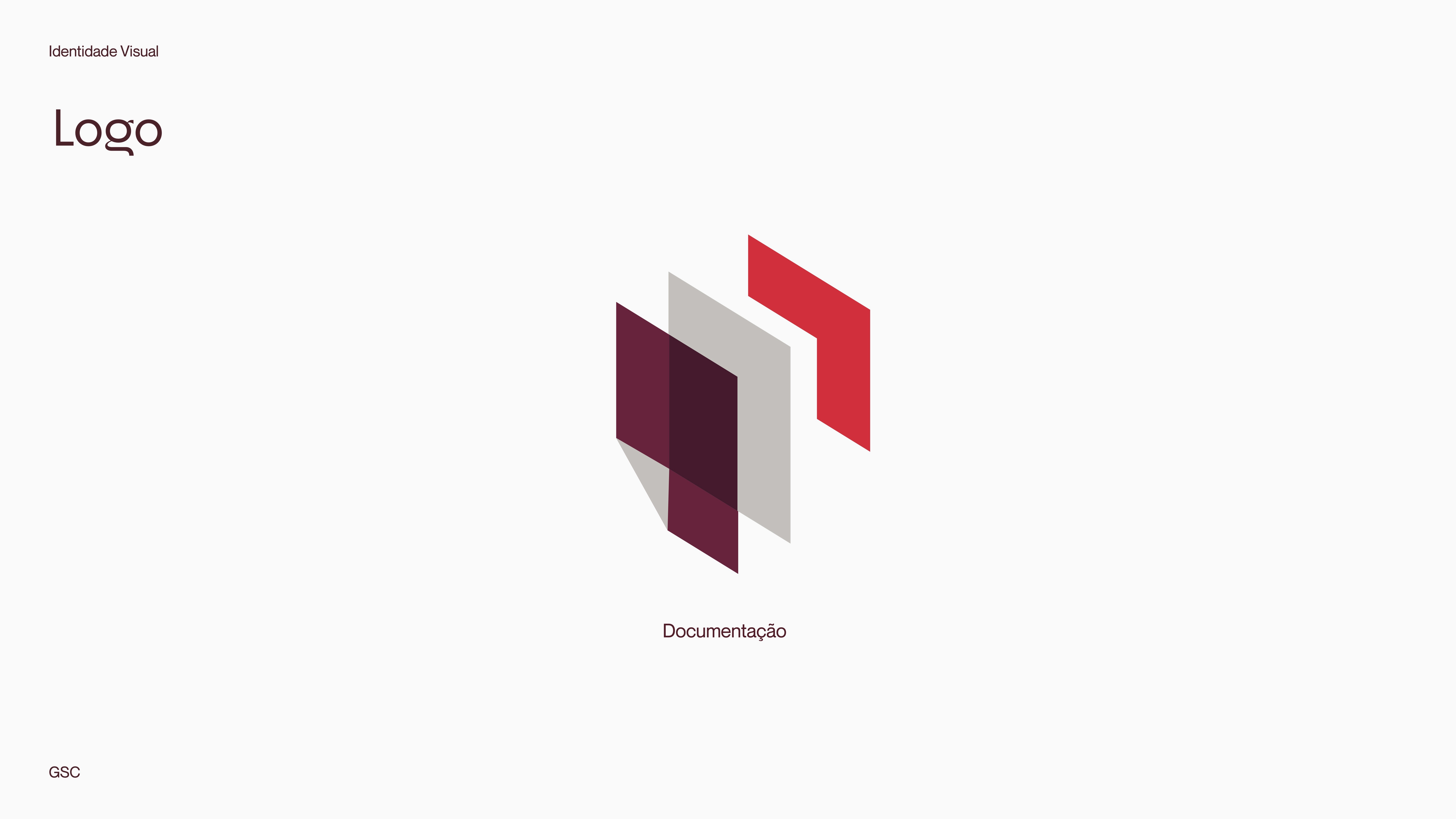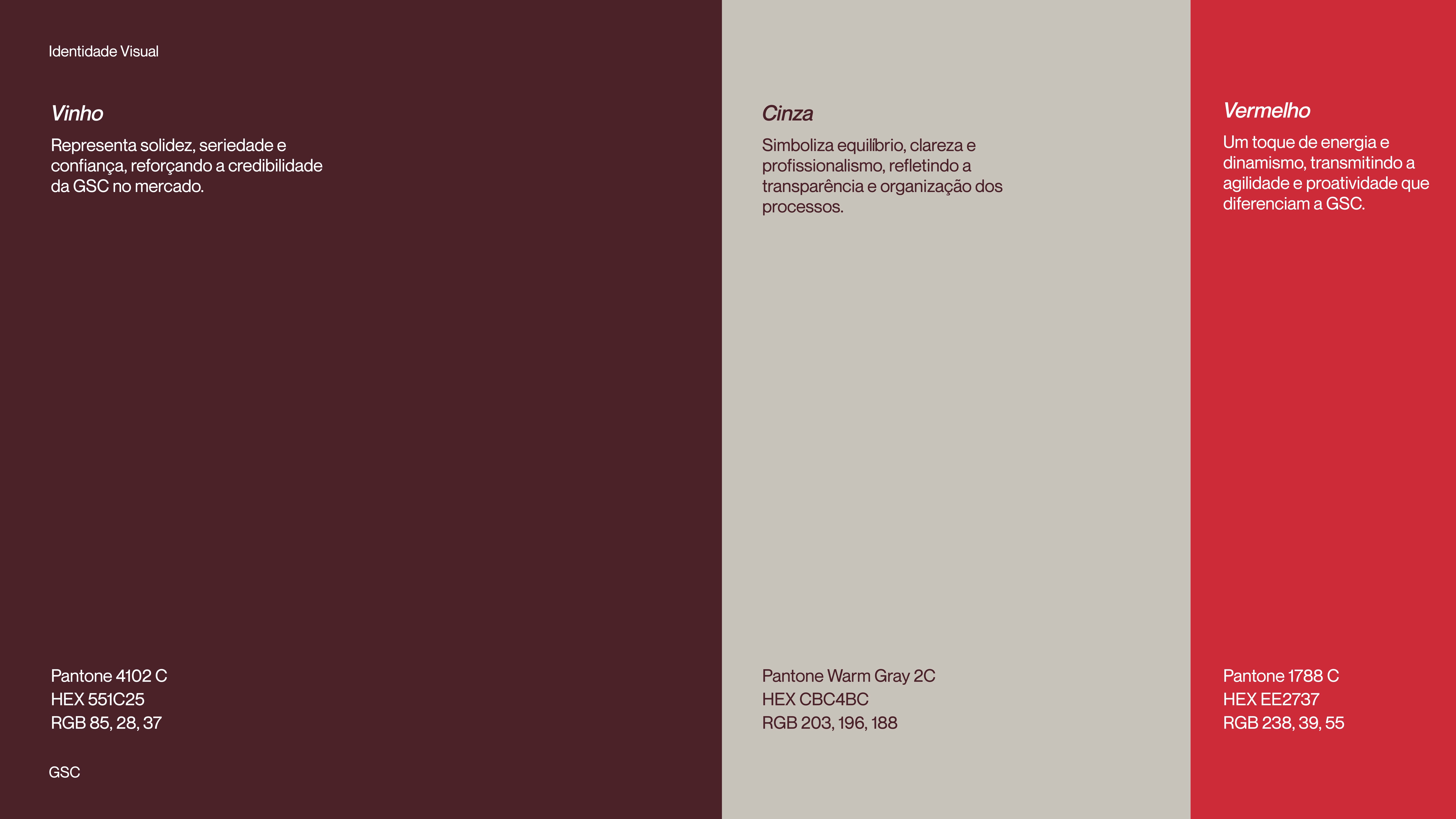 O símbolo traduz visualmente os pilares da marca: setas em movimento representam direcionamento e agilidade, enquanto fazem referência à documentação, produto central do negócio. A paleta reforça o posicionamento: o vinho traz solidez e credibilidade, o cinza comunica equilíbrio e profissionalismo, e o vermelho adiciona energia e dinamismo — refletindo a proatividade que diferencia a GSC no mercado.