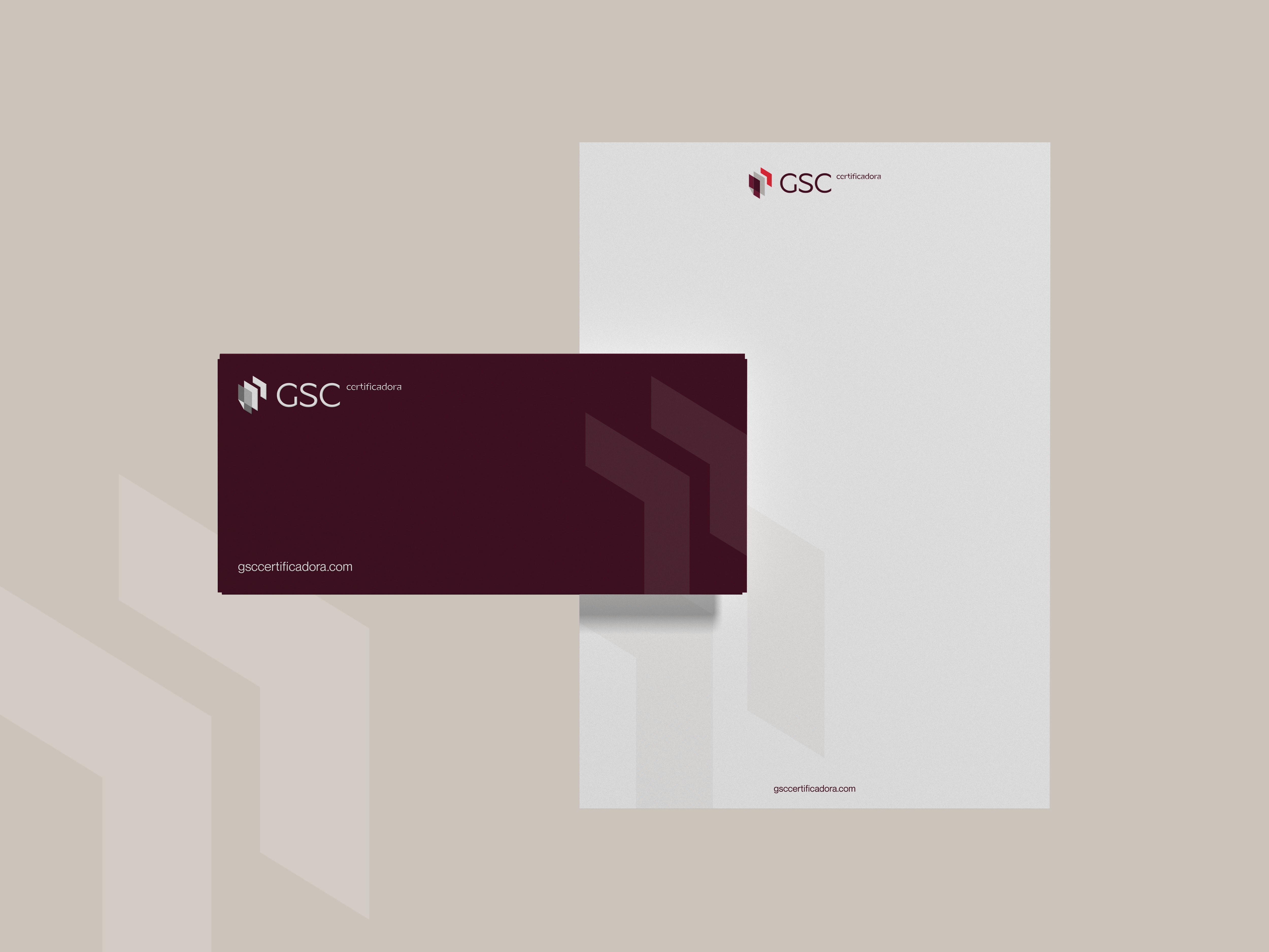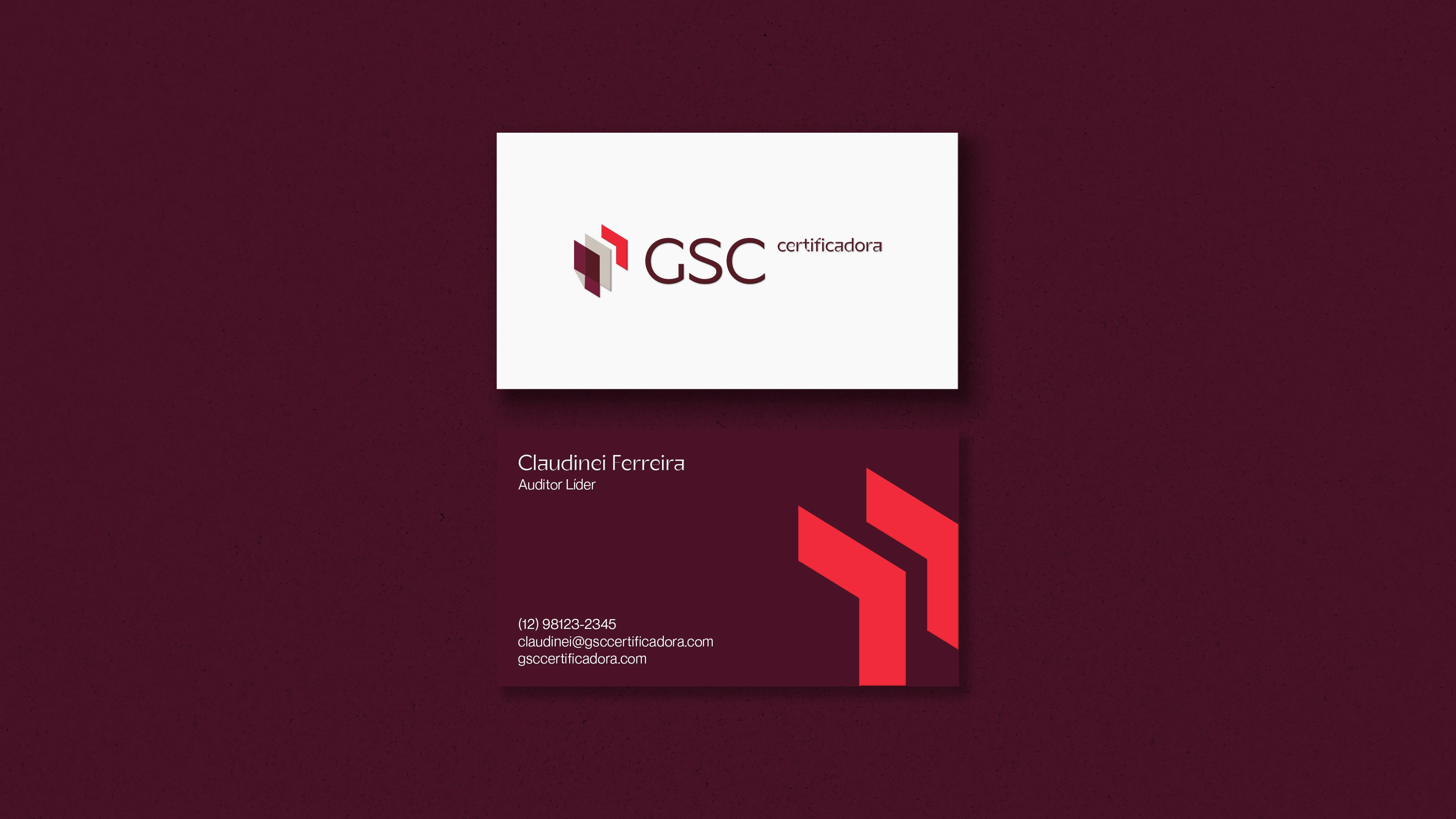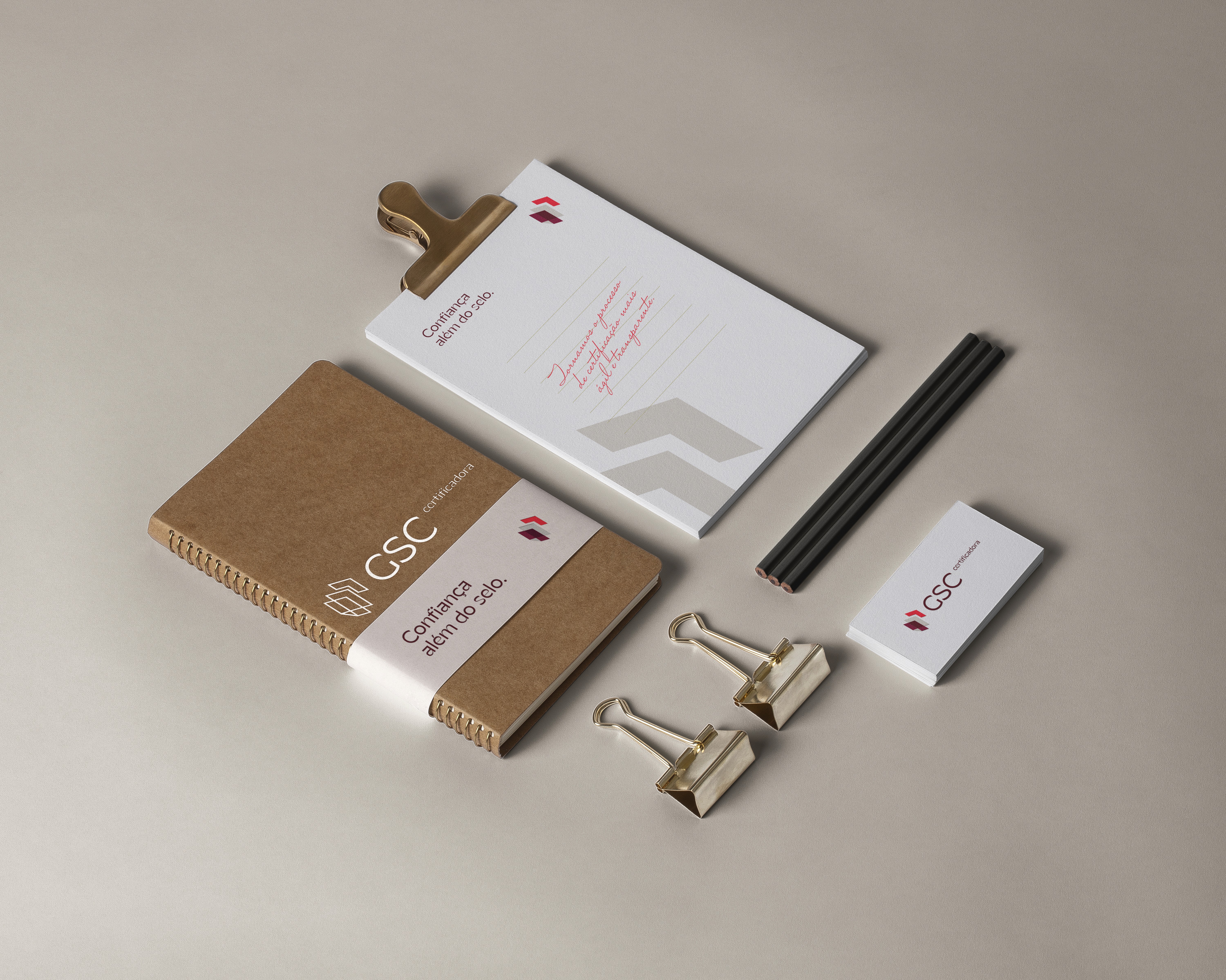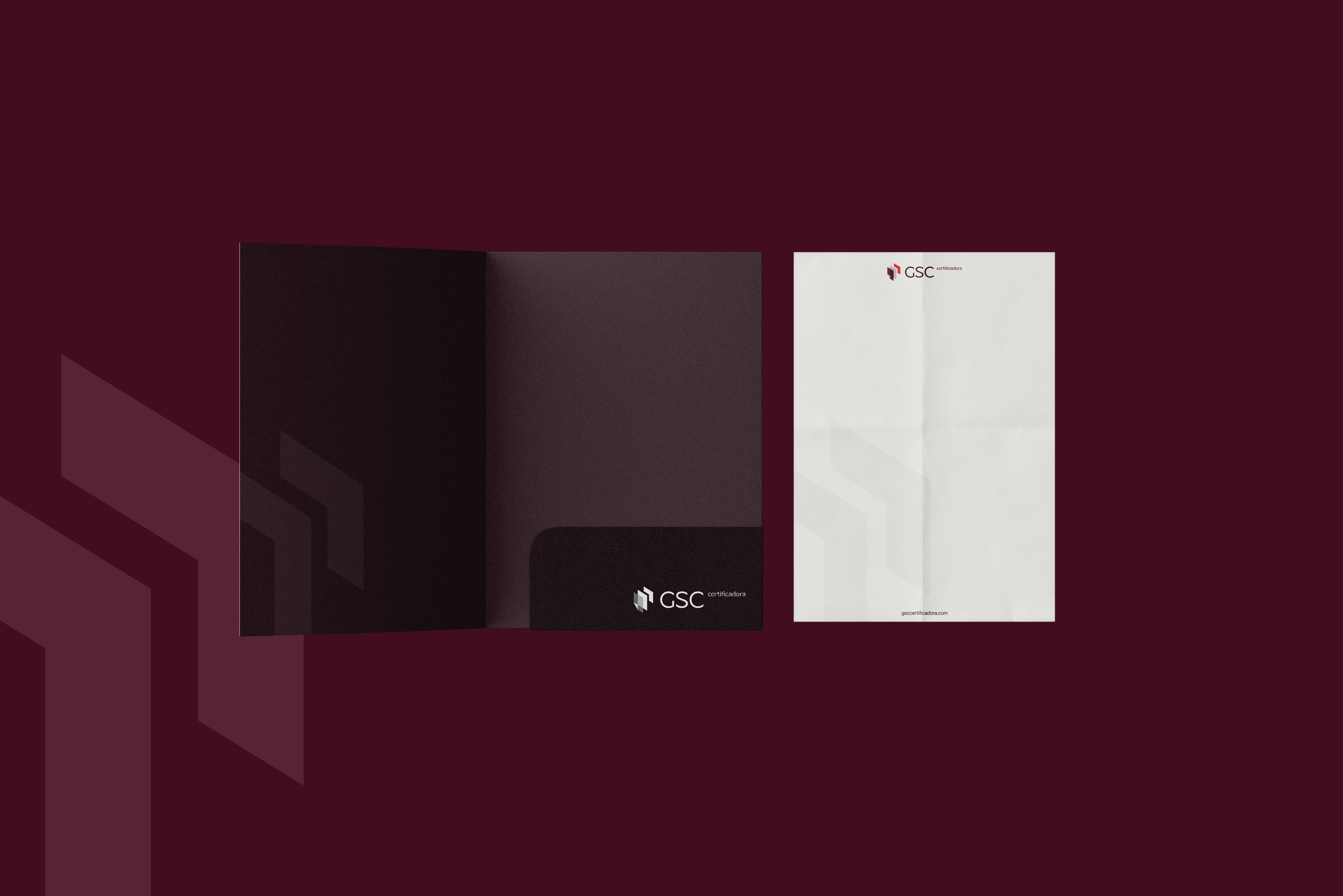 O símbolo traduz visualmente os pilares da marca: setas em movimento representam direcionamento e agilidade, enquanto fazem referência à documentação, produto central do negócio. A paleta reforça o posicionamento: o vinho traz solidez e credibilidade, o cinza comunica equilíbrio e profissionalismo, e o vermelho adiciona energia e dinamismo — refletindo a proatividade que diferencia a GSC no mercado.