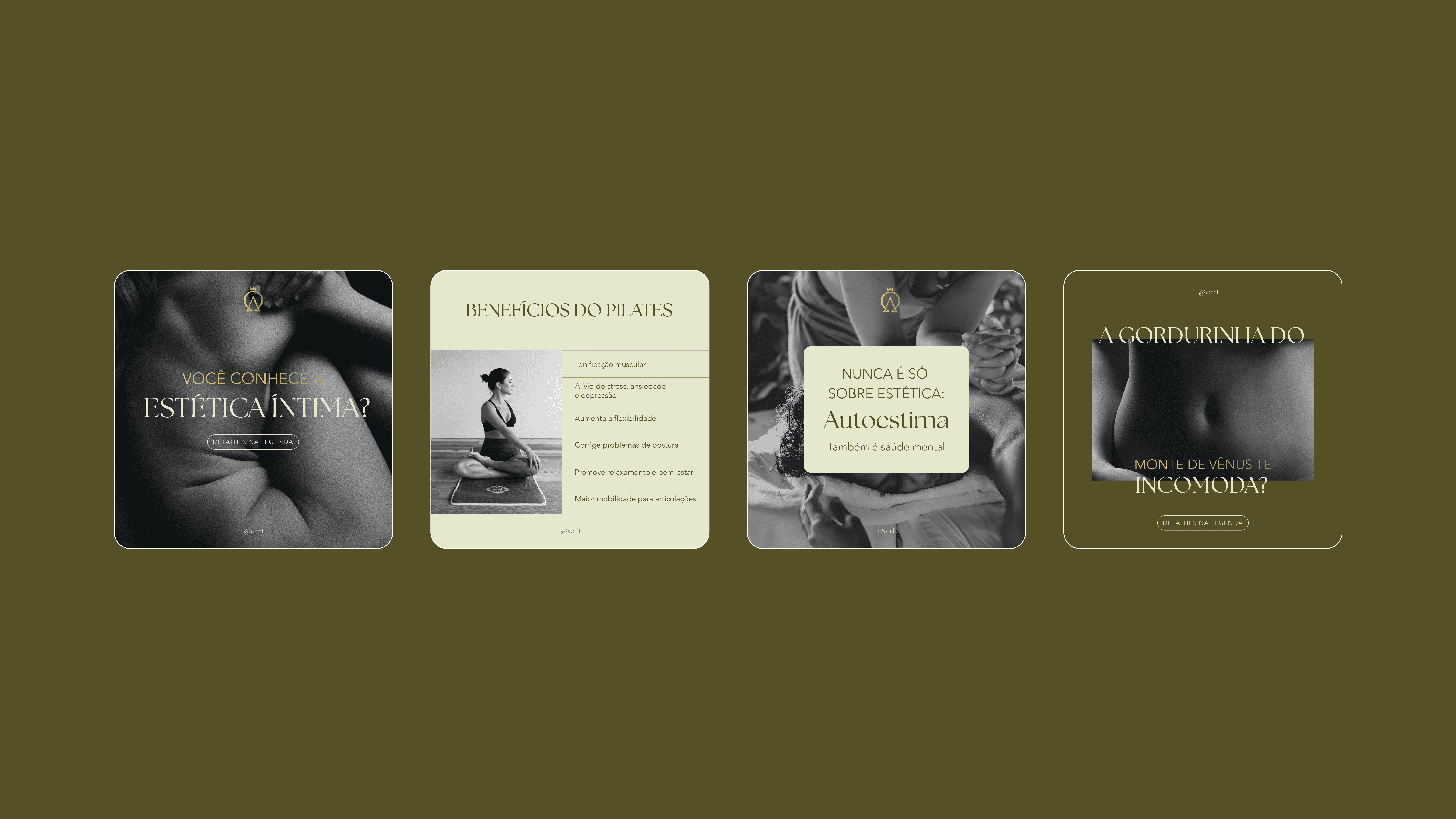 O símbolo une o Alfa e o Ômega — início e fim — representando o ciclo completo de transformação que a clínica oferece, do primeiro tratamento ao acompanhamento contínuo. A coroa sobre as letras reforça o posicionamento de liderança, exclusividade e prestígio. A paleta fecha o conceito: o verde oliva escuro traz profundidade e autoridade, o dourado reforça o luxo e a exclusividade, e o neutro claro equilibra a composição com leveza e refinamento.